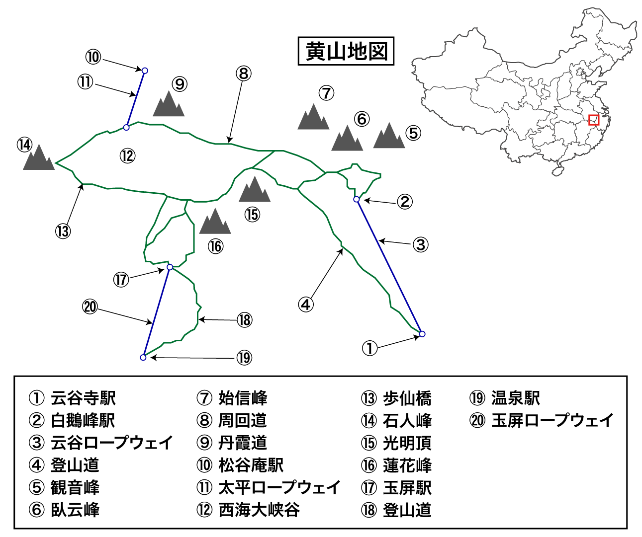 黄山は奇岩、奇峰や松の他に、山の下には翡翠谷・情人谷、鳳凰源などの渓谷や九龍瀑の滝などの名所も多い。山の上の周遊、西海大峡谷や渓谷も訪れるとなると三日ほどの日数が必要である。