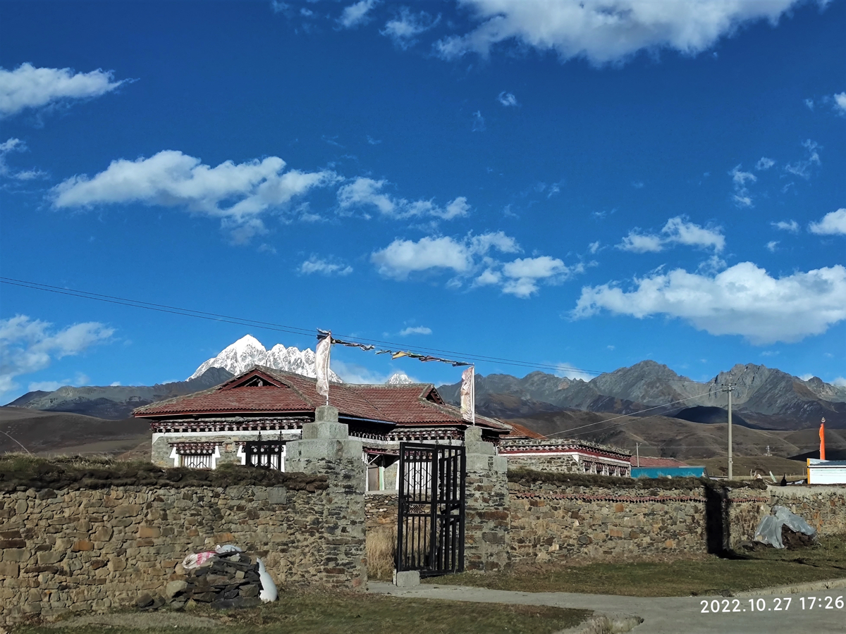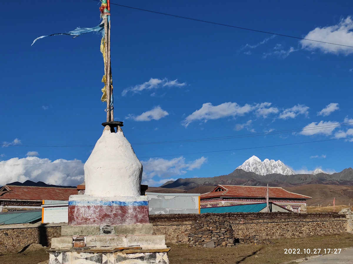 省道434号から離れて、西蔵(チベット)族の小村を通る細い道に入った。村には仏塔があり、その向こうに海抜5820mの亜拉雪山またの名は雅拉雪山の優美な姿があった。亜拉のチベット語の意味は舍得(惜しまない)で“全てを与え賜う”という仏を表しているのだろうか。雅拉雪山は西蔵仏教の神山で、チベットから見れば雅拉雪山はチベット高原の東端に位置するので東方の白氂牛(白いヤク)と呼ばれる。