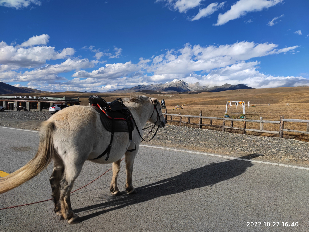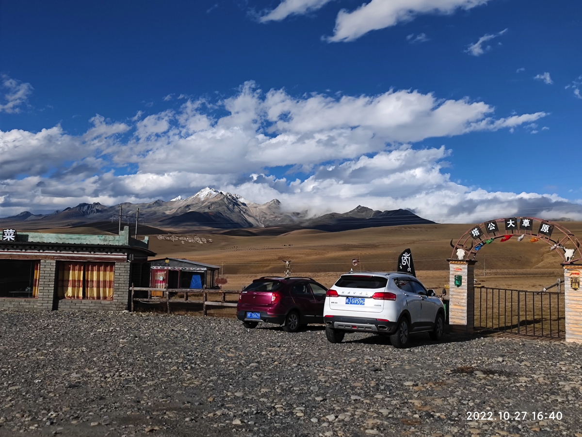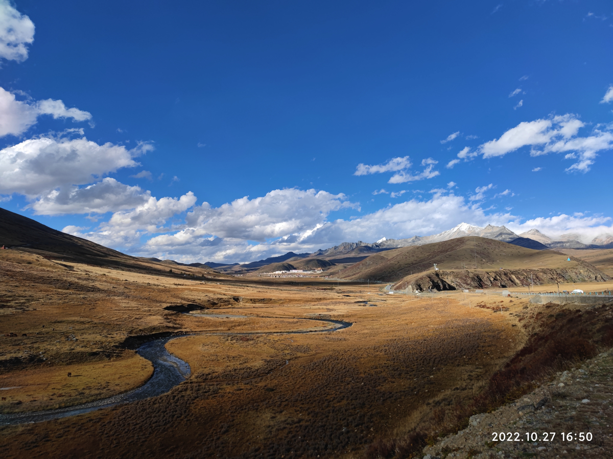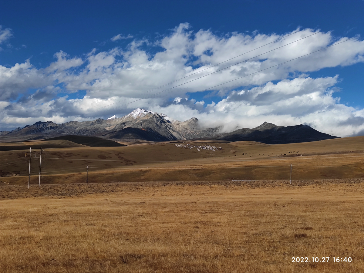 康定空港から省道434号を塔公寺に向かった。山を抜け草原に入っていく。塔公草原だろうか。峠から草原の谷の向こうに雪をいただく荘厳な山、塔公郷に聳える海抜5,305mの青繞(チンラオ)神山が見えた。