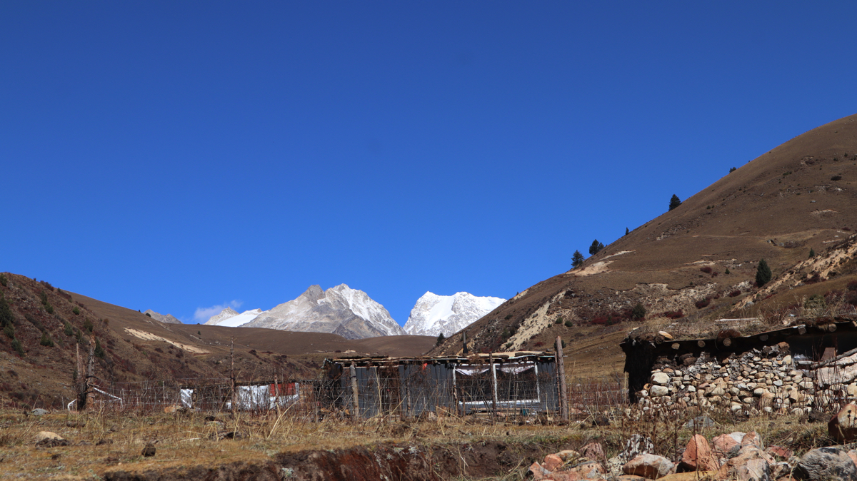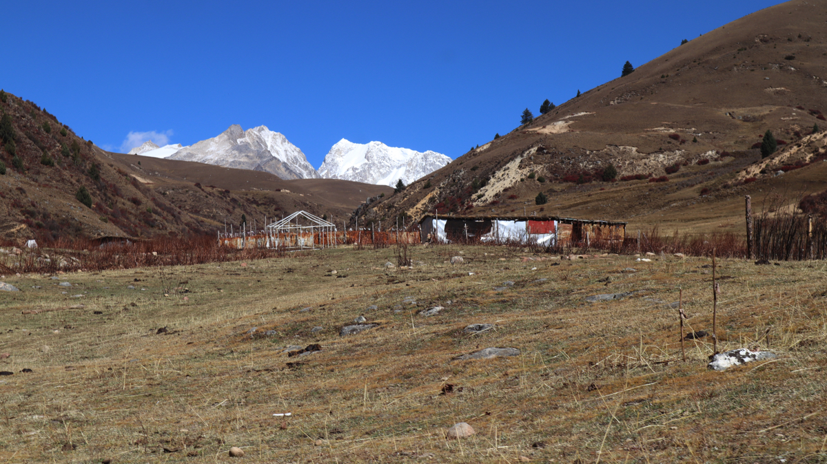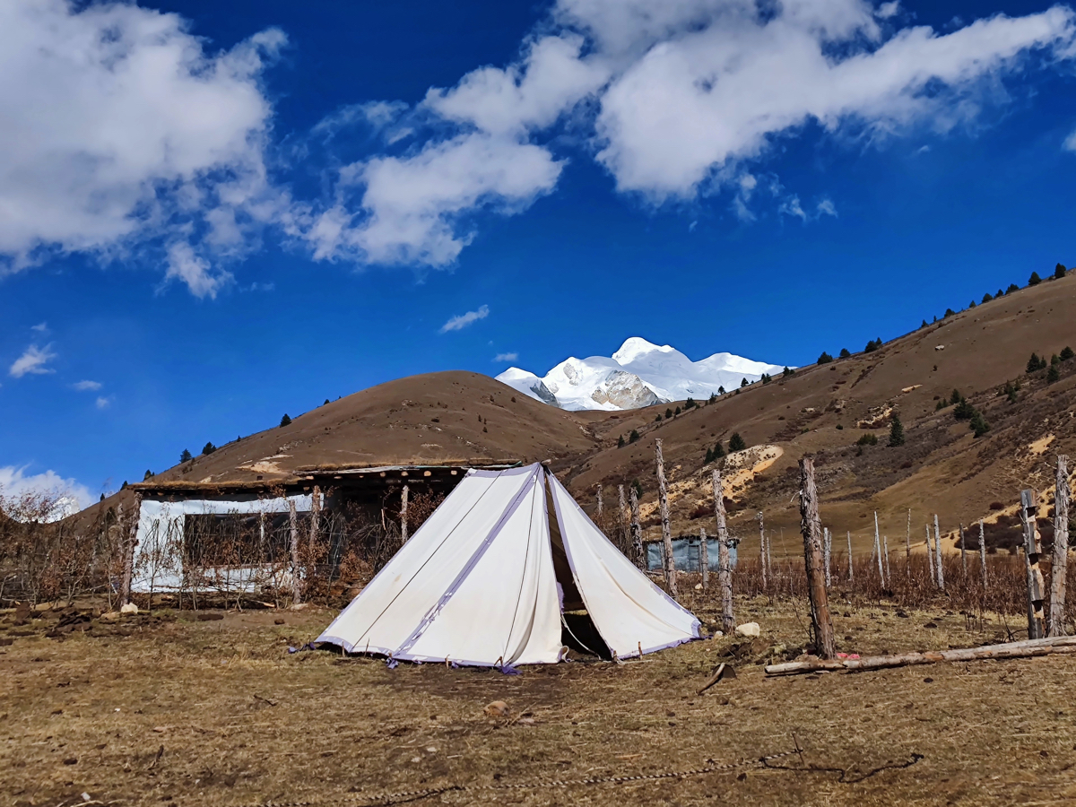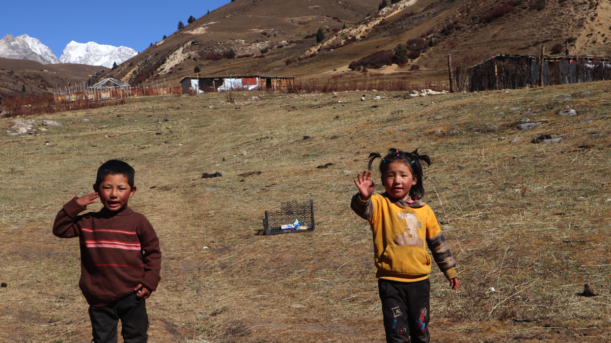 道路脇の山の向こうに時折、真っ白い雪山が姿を見せる。真っ青な空と真っ白い雪山。その対比に感動しながら進むと、牧場だろうか、小さな小屋がありテントが張られ、兄妹のようなかわいい子供たちが私を見て手を振ってくれた。牧場で話を聞きたいと思い車を止めた。チベット族の男性がにこやかに出迎えてくれた。牧場の上を見ると雪の格聶(グニエ)峰が見えている。彼らは夏と短い秋をこの牧場で過ごし、1週間後に麓の村に降りるという。夏の間、子供たちは毎日、すばらしい景色を見ながら山をかけまわっているのだろう。