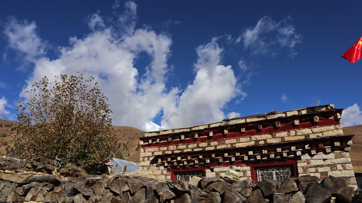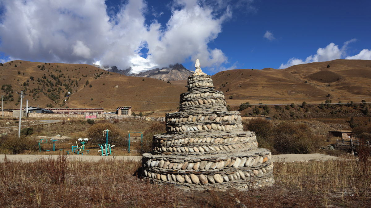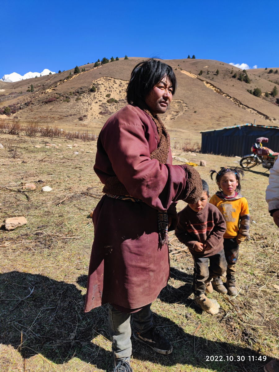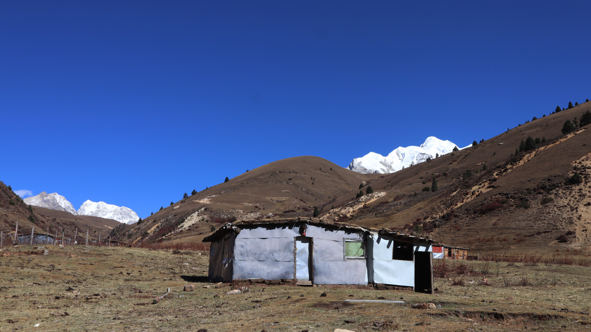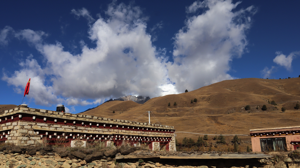 道路脇の山の向こうに時折、真っ白い雪山が姿を見せる。真っ青な空と真っ白い雪山。その対比に感動しながら進むと、牧場だろうか、小さな小屋がありテントが張られ、兄妹のようなかわいい子供たちが私を見て手を振ってくれた。牧場で話を聞きたいと思い車を止めた。チベット族の男性がにこやかに出迎えてくれた。牧場の上を見ると雪の格聶(グニエ)峰が見えている。彼らは夏と短い秋をこの牧場で過ごし、1週間後に麓の村に降りるという。夏の間、子供たちは毎日、すばらしい景色を見ながら山をかけまわっているのだろう。