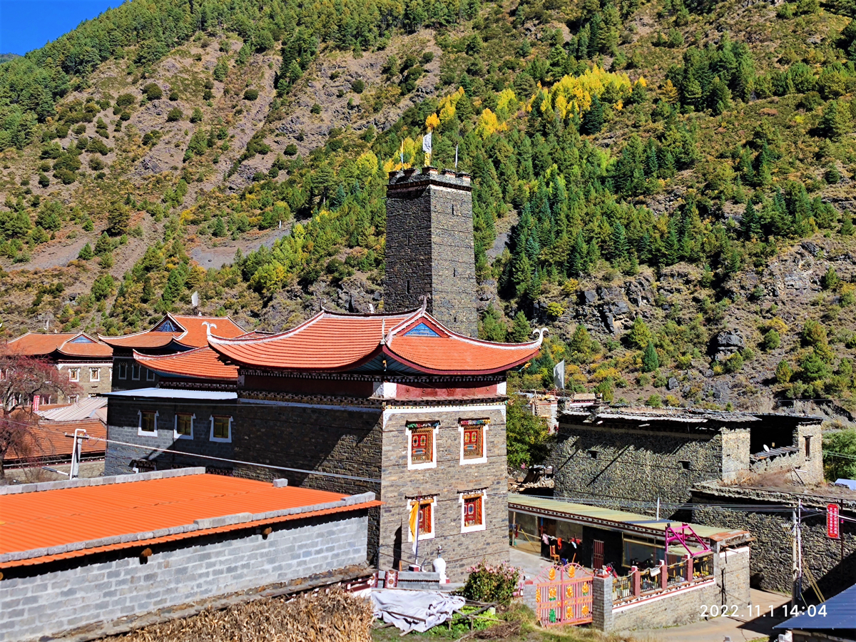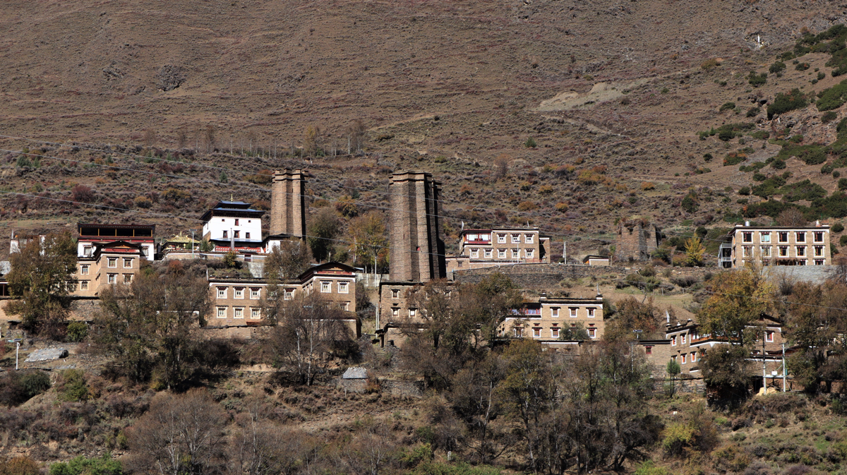 沿道には羌(チャン)族の家も多く「羌寨(チャンサイ)碉楼」の建物が見られた。「羌寨碉楼」は四川省西部に暮らす羌族の家に見られ、外的に備えるための見張りや穀物、薪などの備蓄にも使われた石積の塔で、6階から13階ほどの高さである。羌族は“アルマ”「雲の上の民族」とも言われる。高原地帯に住むからだろうか。碉楼の大きさや形で部族の力、村の規模が解かるといわれる。