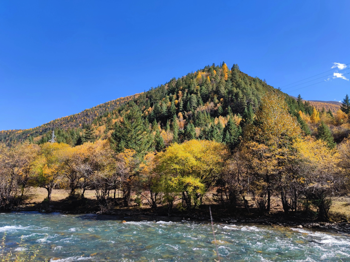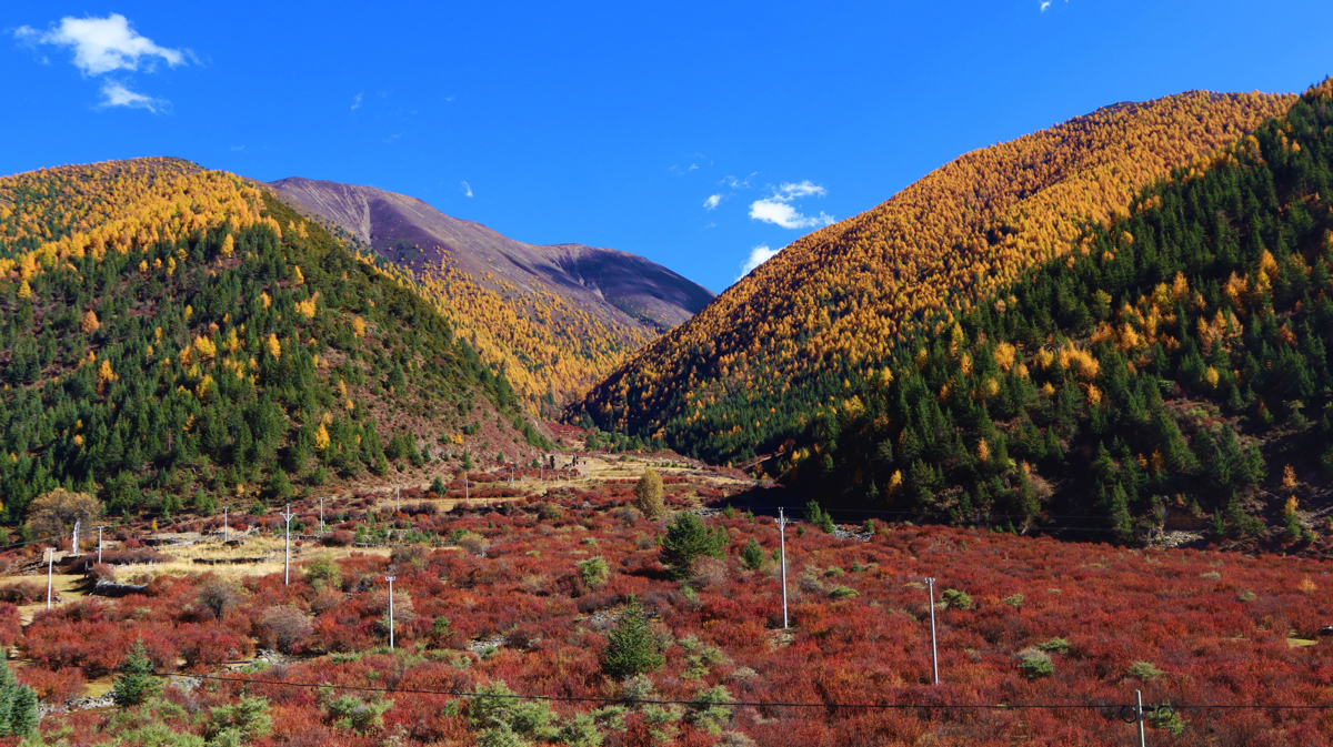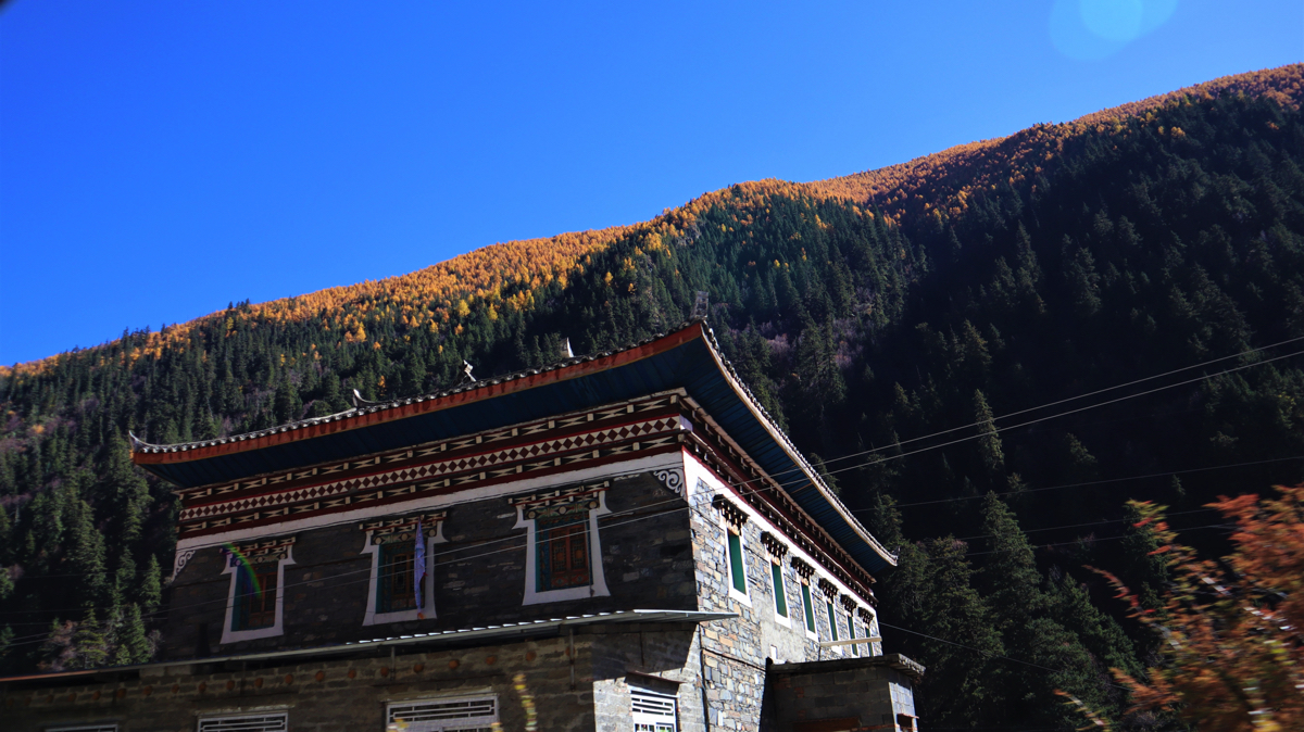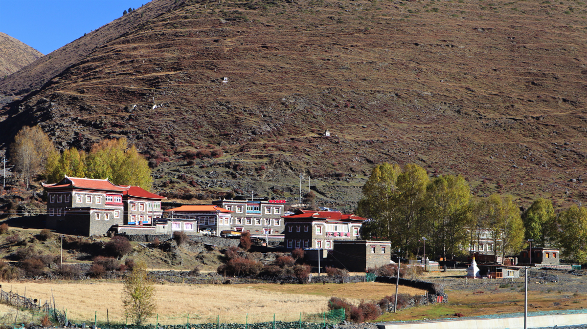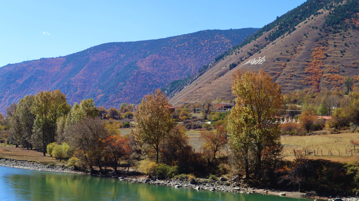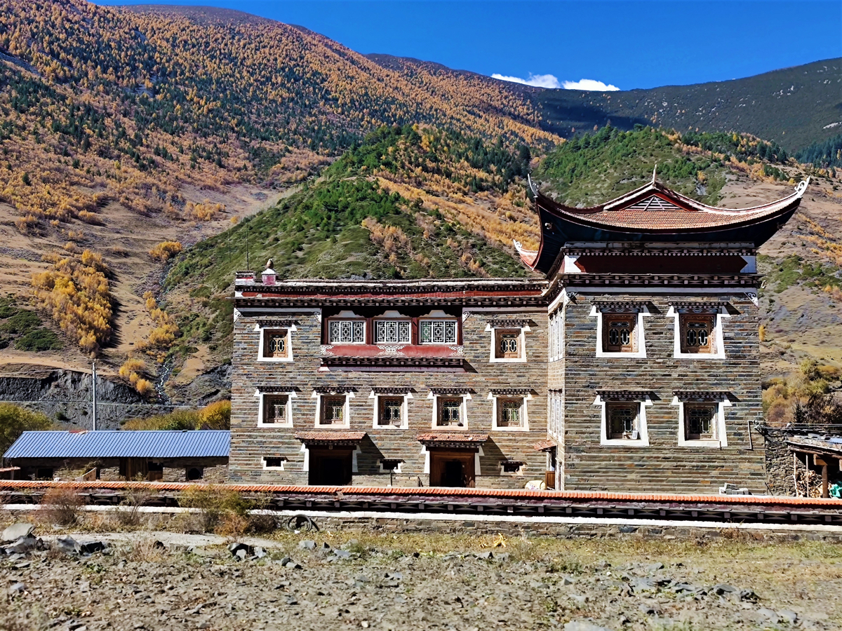四川省一の高山、海抜7556mの貢嘎山が見える絶景スポットはいくつかある。雅江から新都橋の途中には、昔の祈りの場の遺跡、不思議な石積の黒石城があり、山の頂から貢嘎山が見える。感動中国100第16回―4では新都橋郊外の山の上から夕陽の貢嘎を紹介した。今回はもっと近くでと思い、新都橋を南に向かい貢嘎山鎮を通って冷嘎措(ロンガツォ)に向かった。その沿道はチベット民家が美しい紅葉に映えていた。