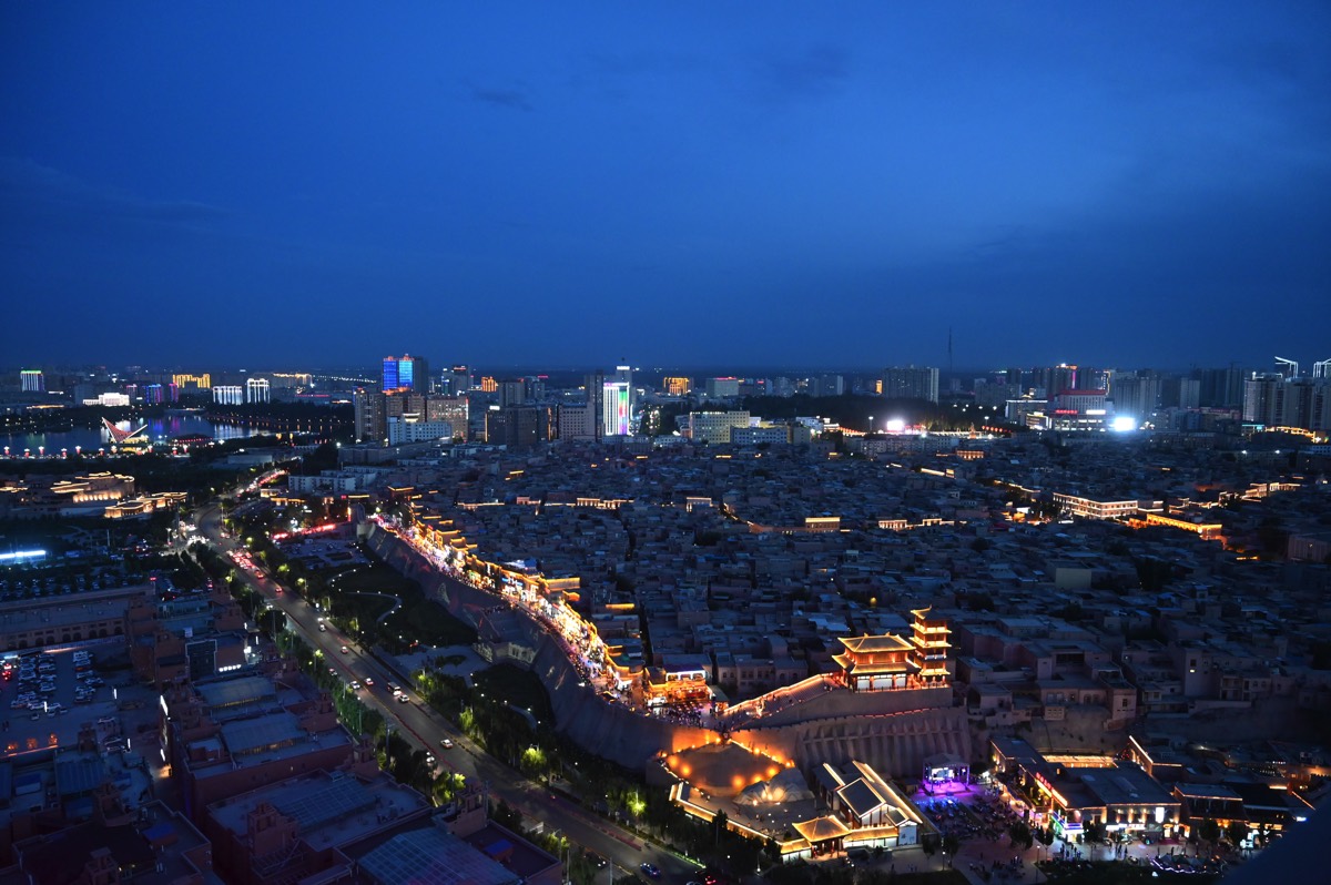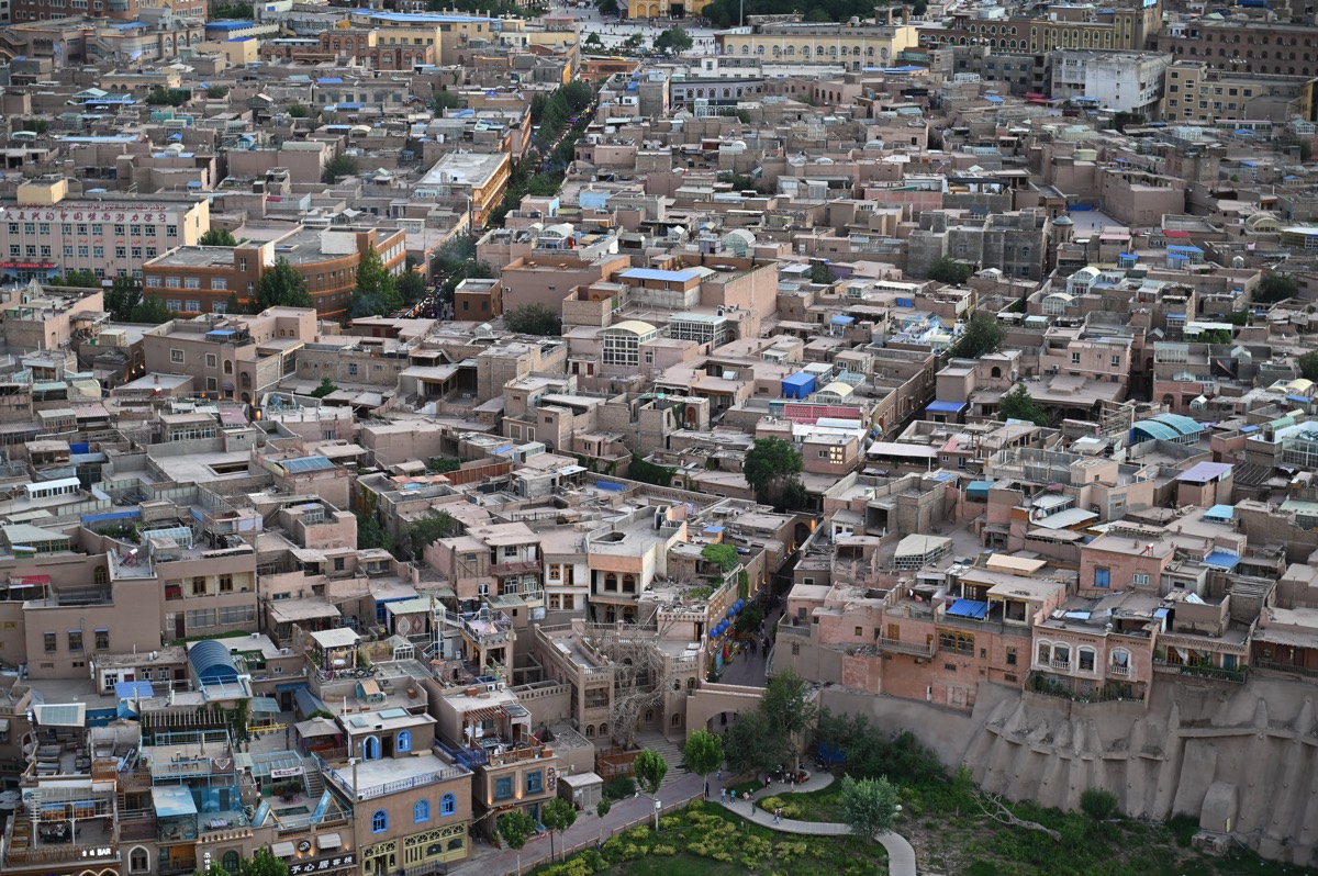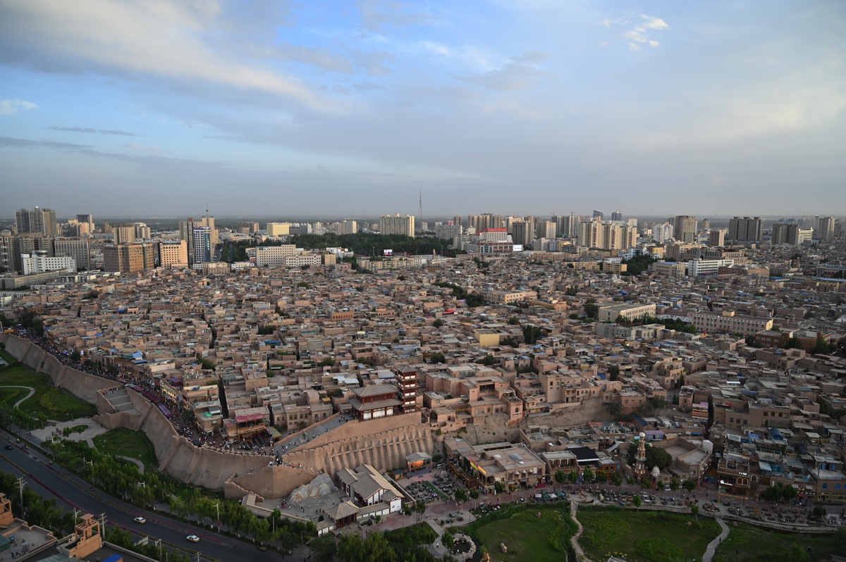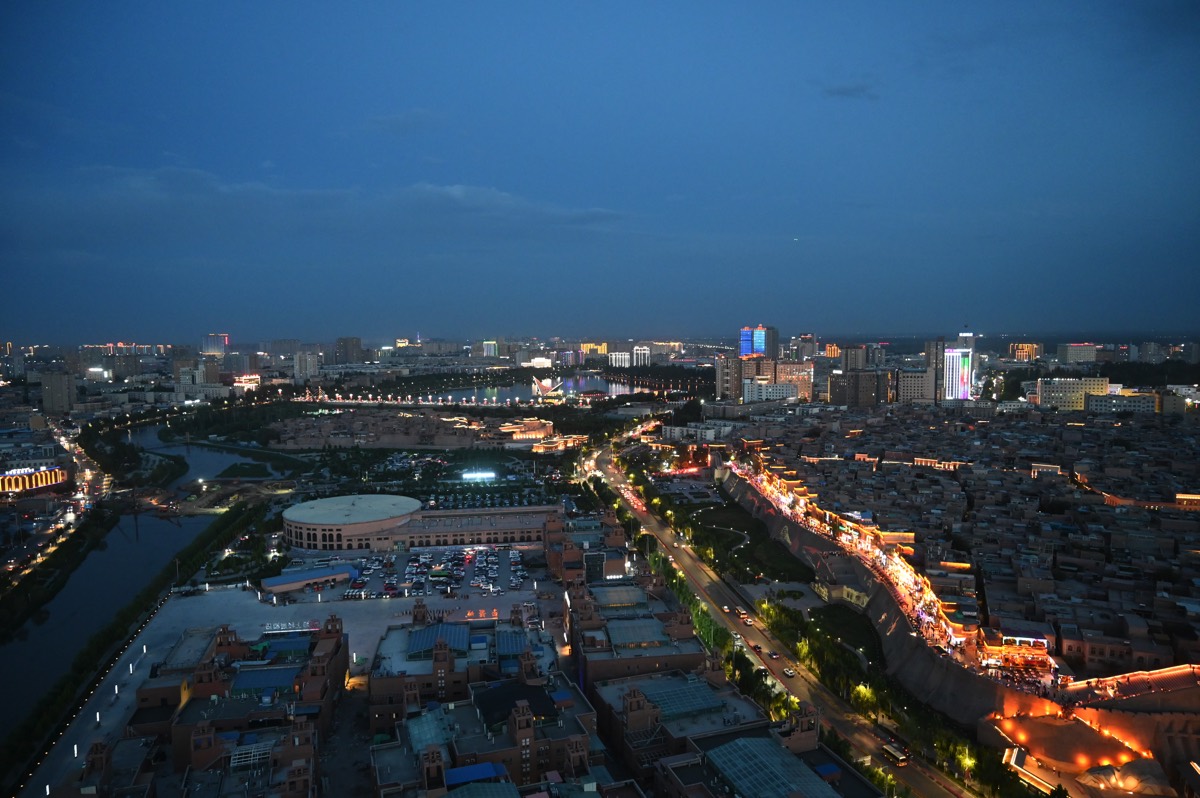喀什空港に着いたのは夜10時を過ぎていたがまだ明るかった。中国の広さと西域に来た実感が湧く。夜の11時はまだ地元の人の夕食時間だった。有名な喀什の古城全体を見ようと思い、古城の近くの高さ169mの崑崙塔に上がった。崑崙塔からは真下の喀什古城や喀什市街だけでなく、遠く崑崙山脈を望むことができる。国境近くの山に夕陽が沈み、夕陽に染まった古城を見ることができた。