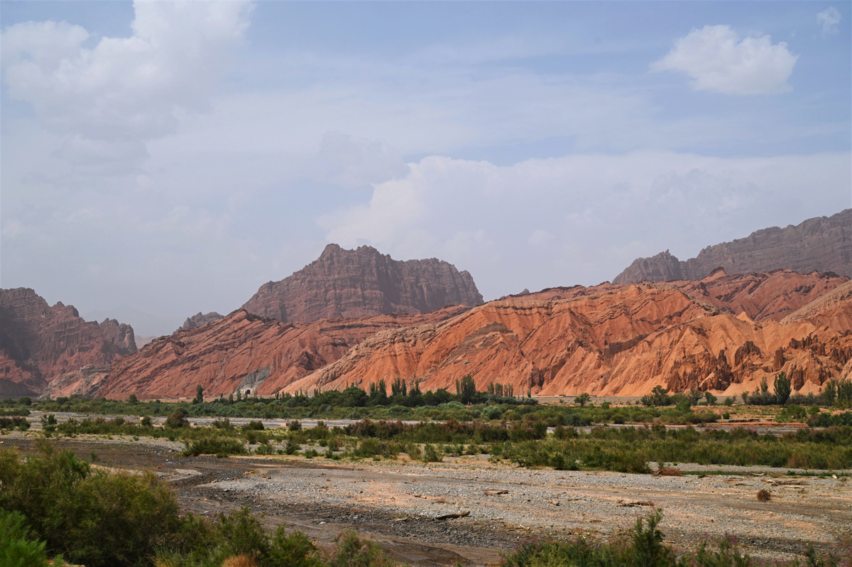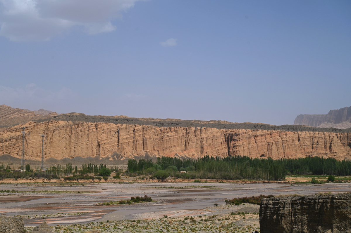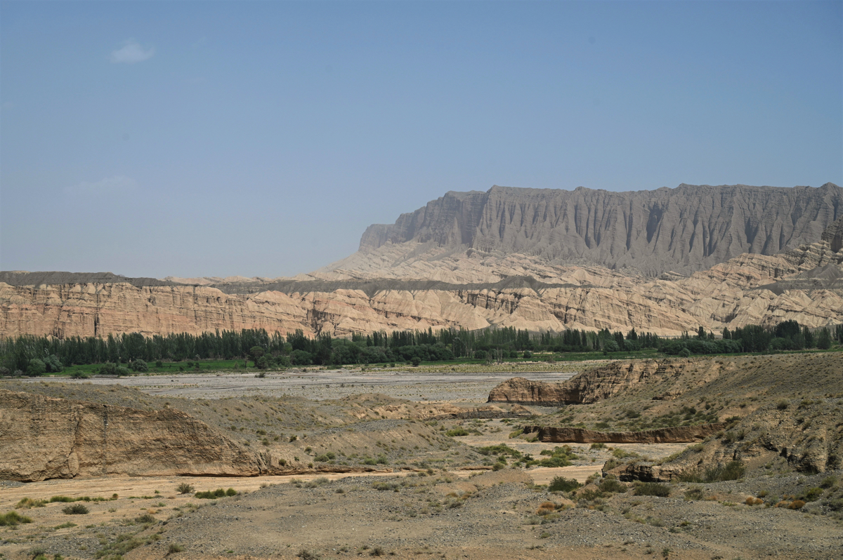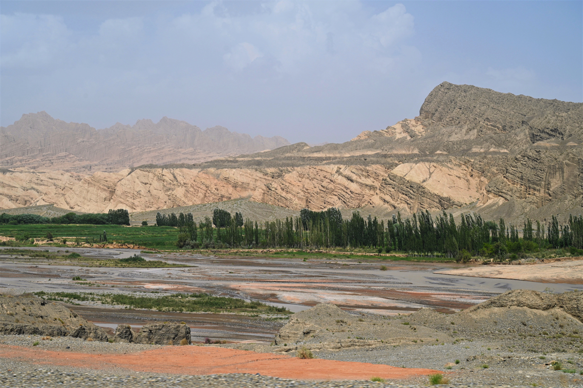 果てしなく続く砂の世界、タクラマカン砂漠を北に向かえば雪の天山に入る。砂漠の近くに雪山がある。世界でも数少ない風景だろう。砂漠と天山との間には褐色の山々がある。そこには感動中国100の第37回で紹介した、マッチを擦れば燃え上がりそうな火焔山のような山が続いている。その褐色の世界の中に庫車峡谷、別名は天山大峡谷がある。周囲は褐色の山ばかりだが、そんな中にも川が流れ、オアシスのように緑の樹木が茂っていた。茶褐色の世界と緑、対照的な美に感動する。
