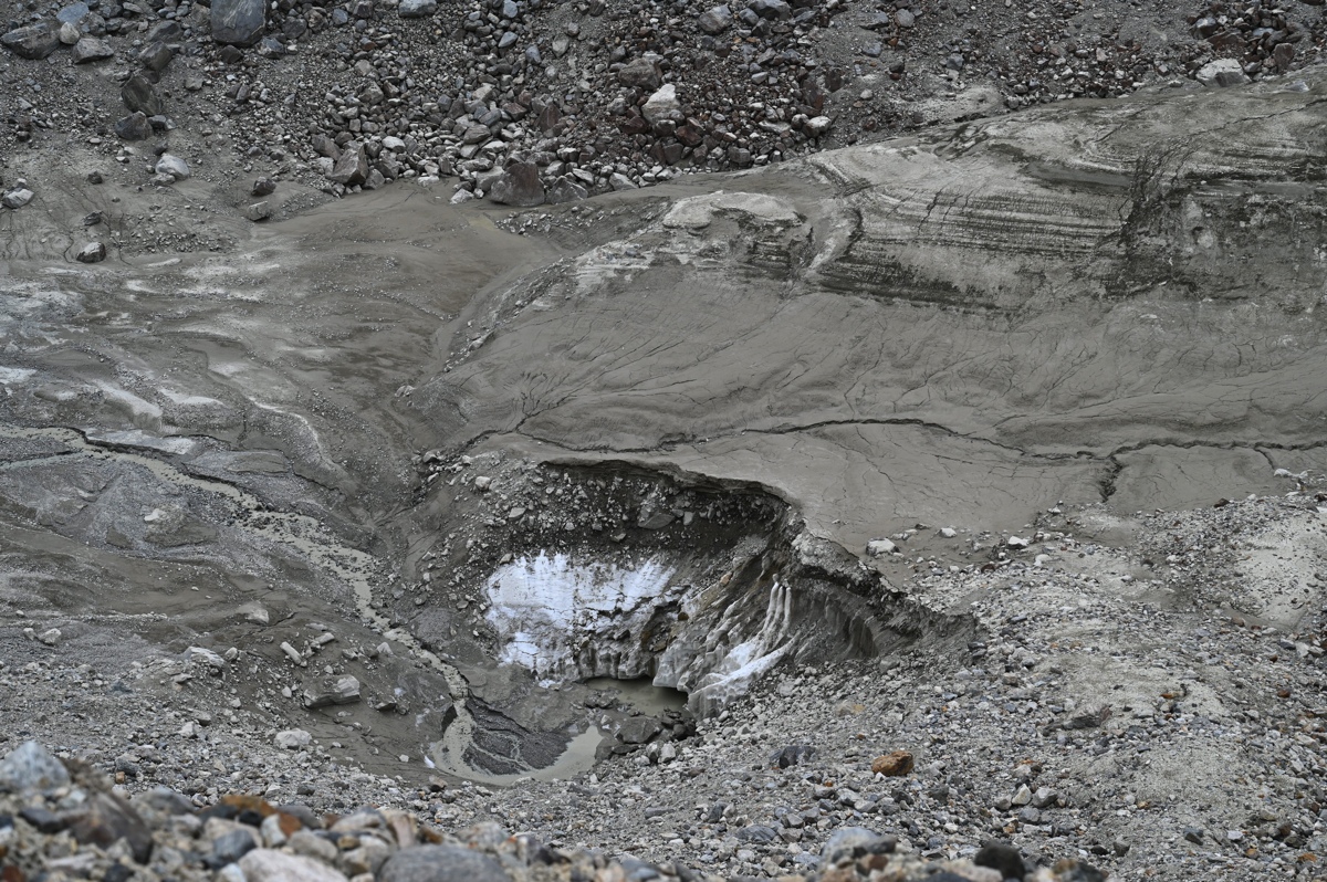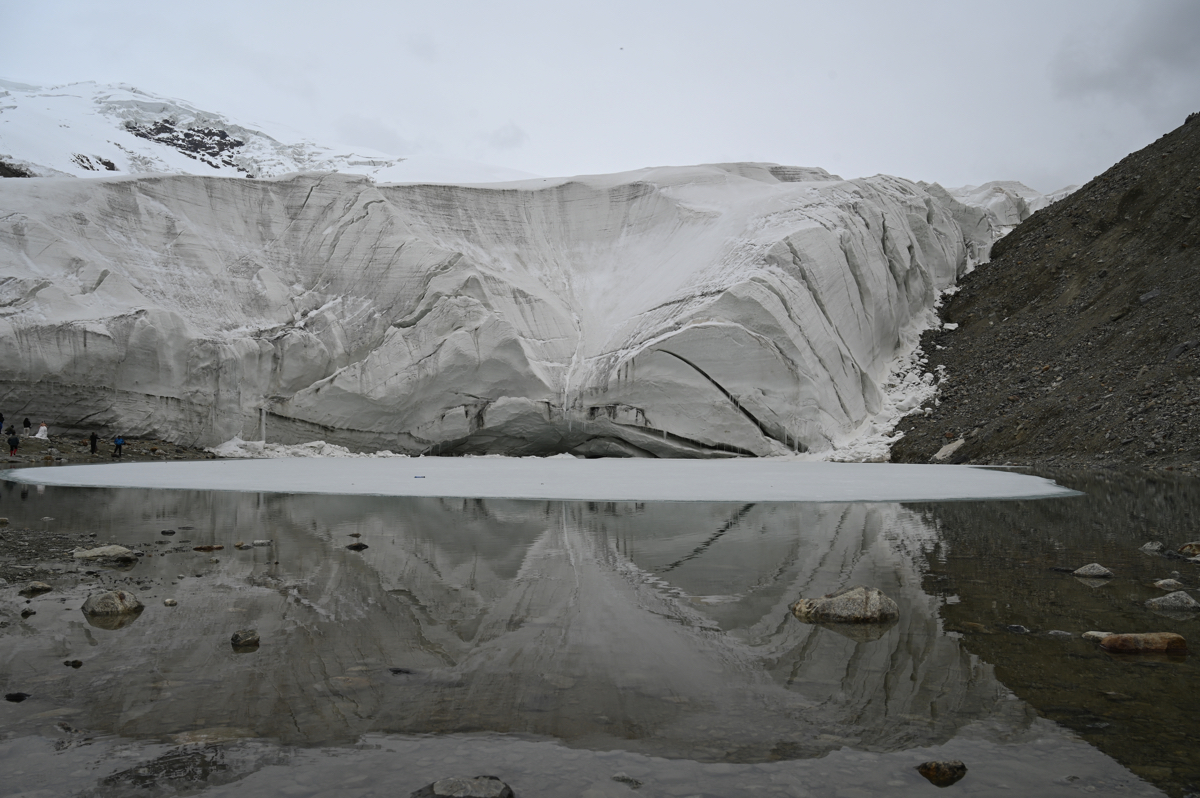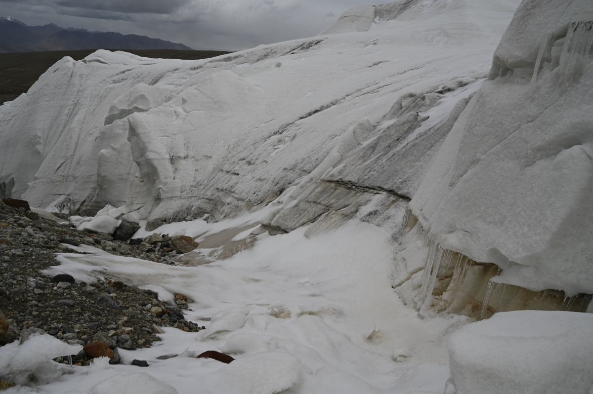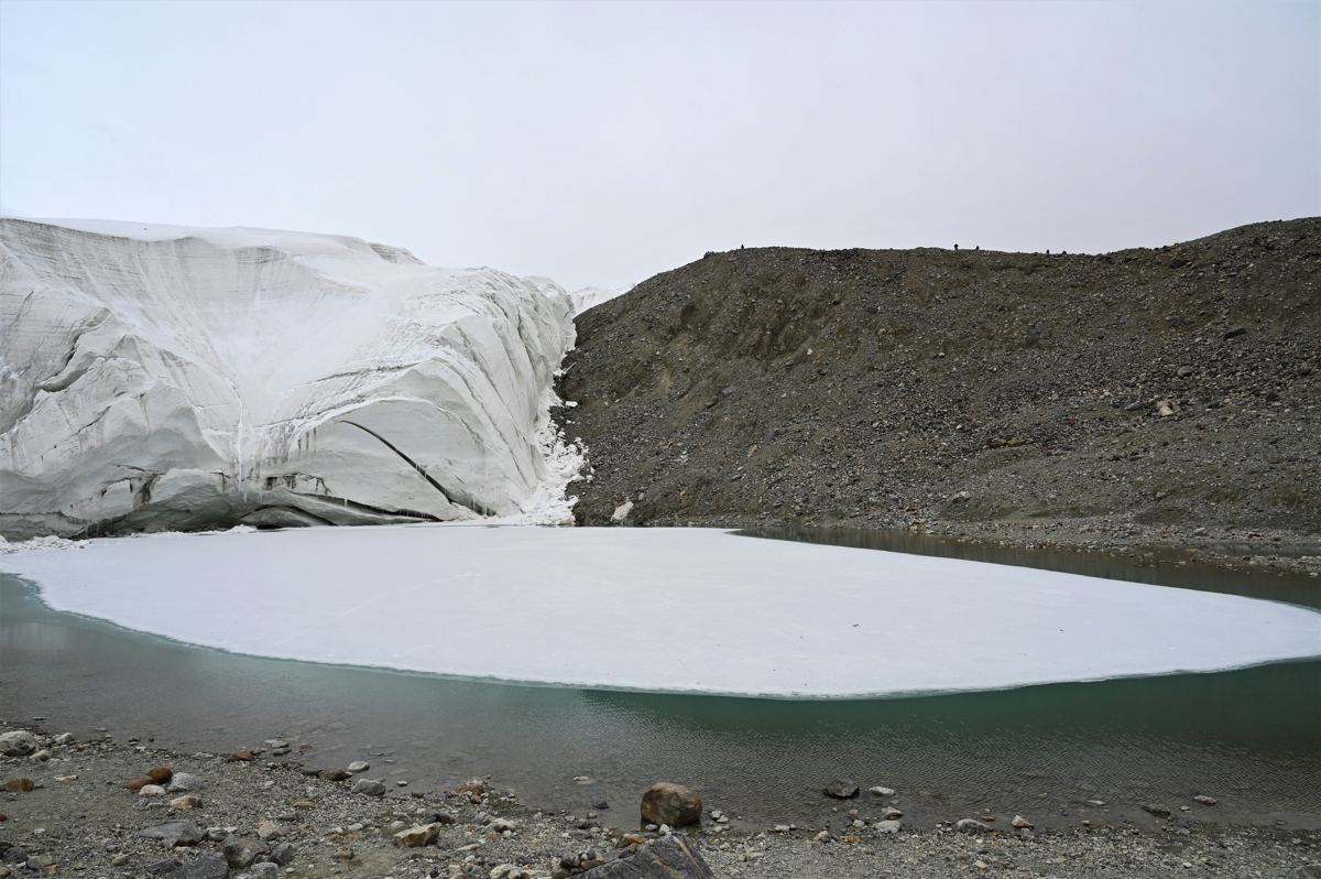 氷河の上を歩きたくなり、湖の上の山に登った。山の上から見る湖と氷河、慕士塔格(ムスタク)峰の頂上に向かい長く続く氷河はすばらしい風景だった。氷の張った白い池。青い水の池、対照的な池の向こうに氷河が拡がり、それは生き物のように、麓の山を飲み込んでいくかのように長い舌を伸ばしていた。