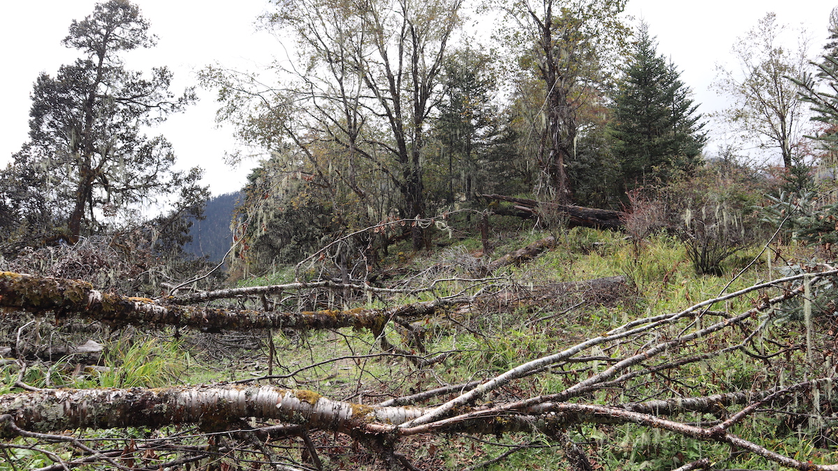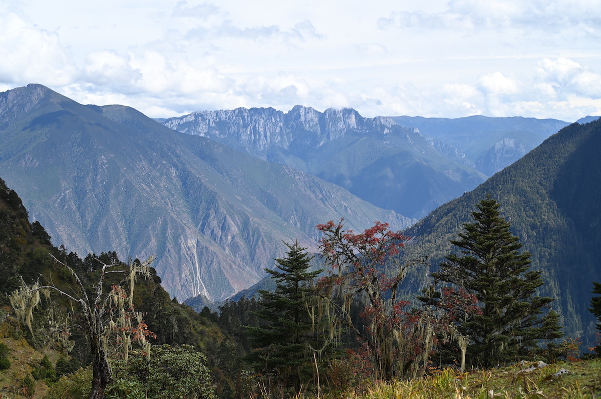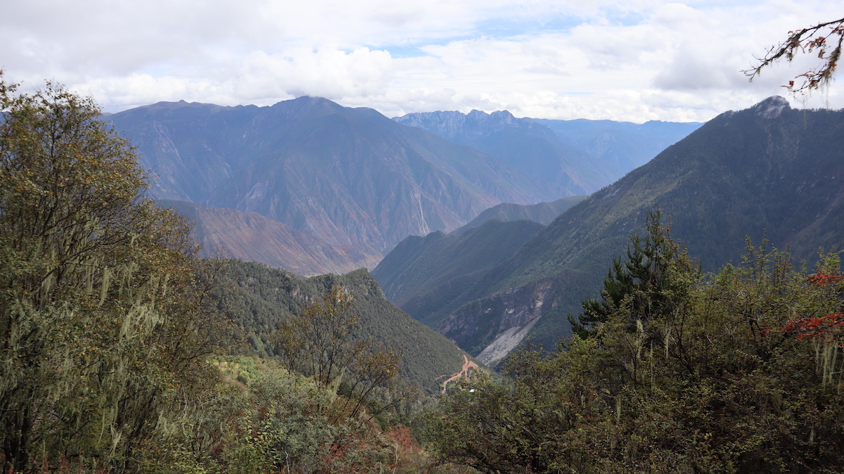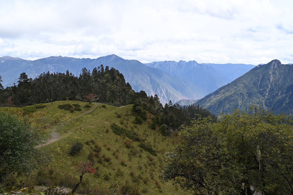 以前に登った四姑娘山の麓の村からキャンプ(感動中国100第39回)の距離、16㎞より短いので大丈夫と思ったが、高低差1200mの登りはきつかった。四姑娘山はキャンプまでは尾根をゆるやかに登った。当初計画はテントや食料など、荷物用ともう一頭、同行の黄さんと私、どちらかが疲れたら馬に乗ればと考え、二頭と計画したが念のため前夜にもう一頭追加した。広い台地に出て昼食をとった。馬も疲れたのか一頭は寝転んで休んでいる。ここまで登り、馬を追加したことが正解だったことがわかった。