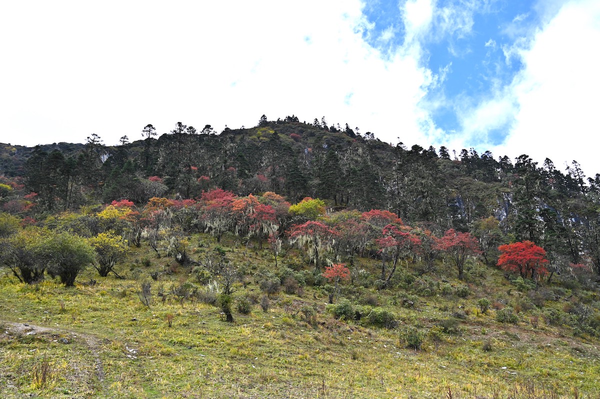 同行の黄さんは最初から馬に乗って、私もかなりの距離を馬に頼った。歩いて写真を撮りながら登ろうとすれば、それでは陽のあるうちに牧場に着けないので乗ってほしいと言われ、かなりの時間、馬を利用した。岩の多い急な山道を馬に乗るのも大変。必死に鞍を持ち、油断すれば灌木の枝が身体や顔にあたる。