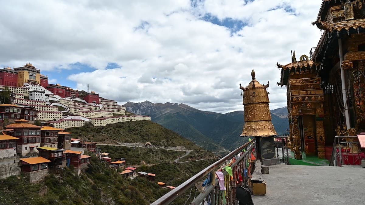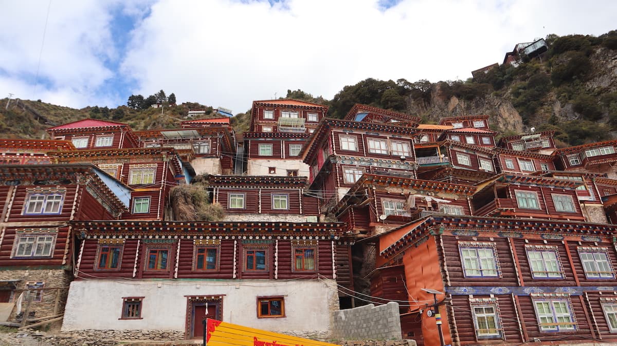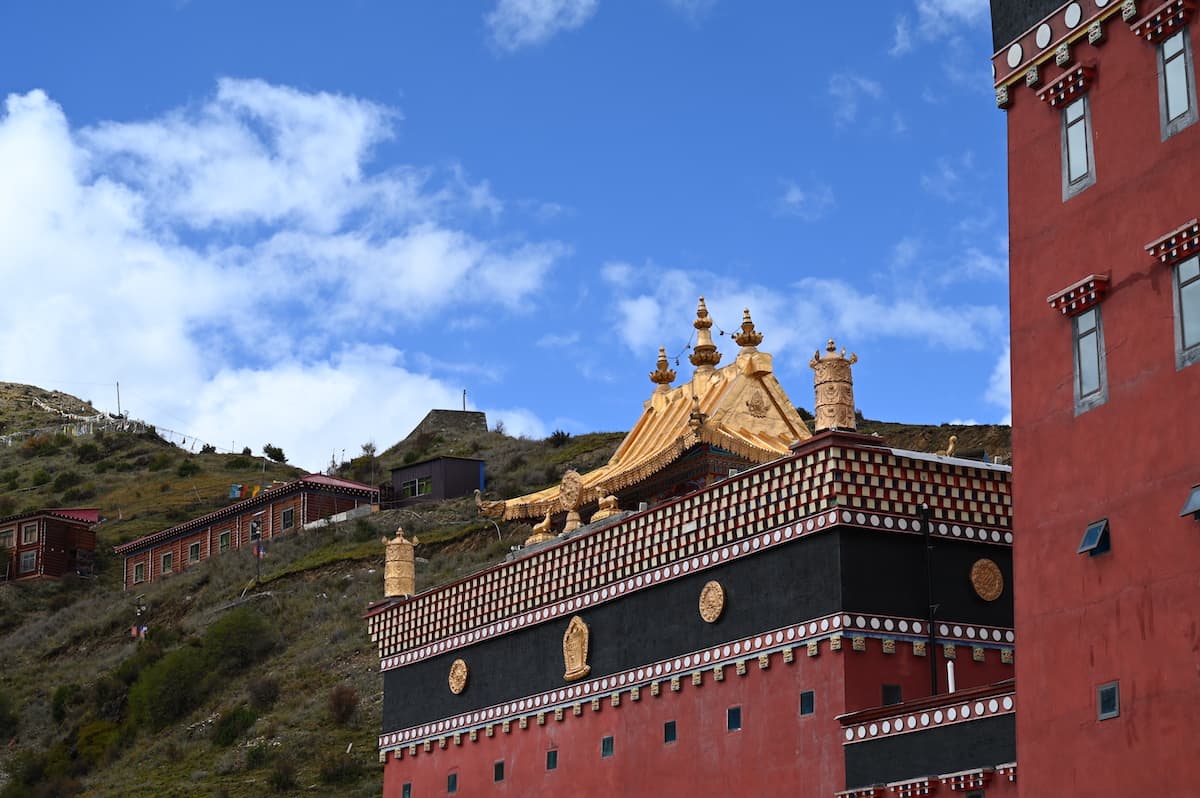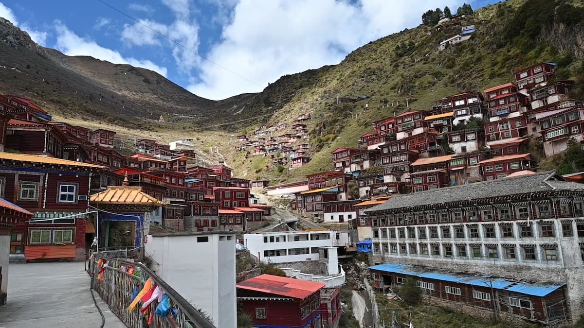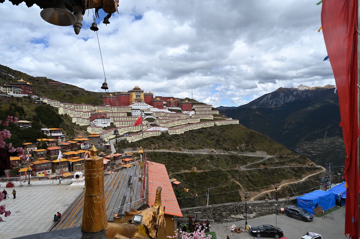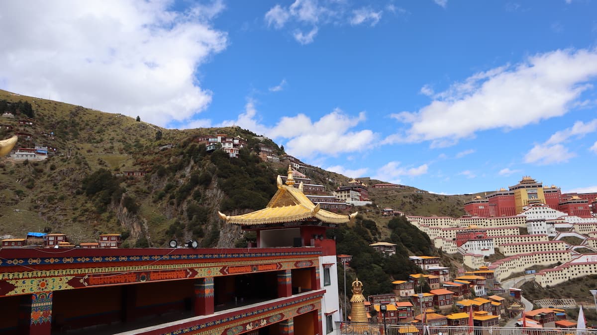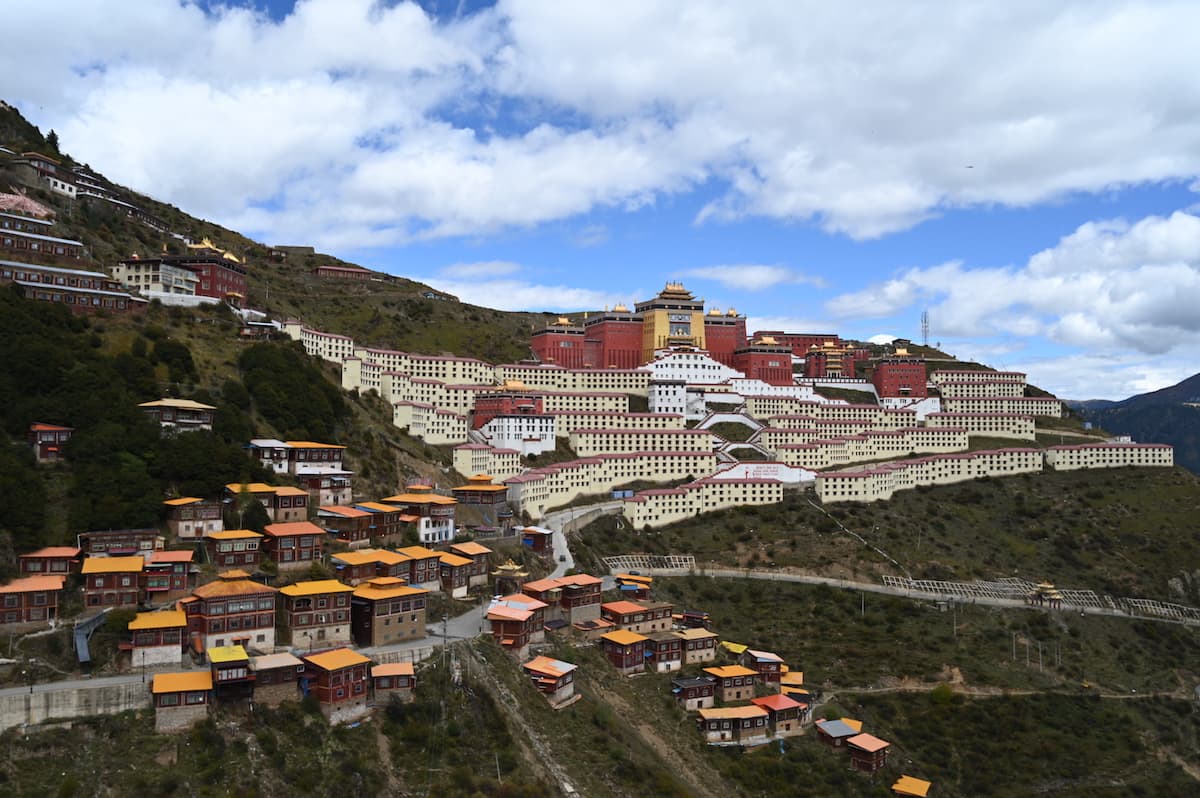 十明佛学院への途中で車を停め、山を見上げると寺院とその周辺に隙間なく立っている紅色の家々が並ぶ壮観な風景、その全体を見ることができる。十明佛学院は海抜4800mにあり、山頂の施設は海抜5000mを超えると思える。学生たちは毎日、海抜5000mの場所で修行、学習をしている。