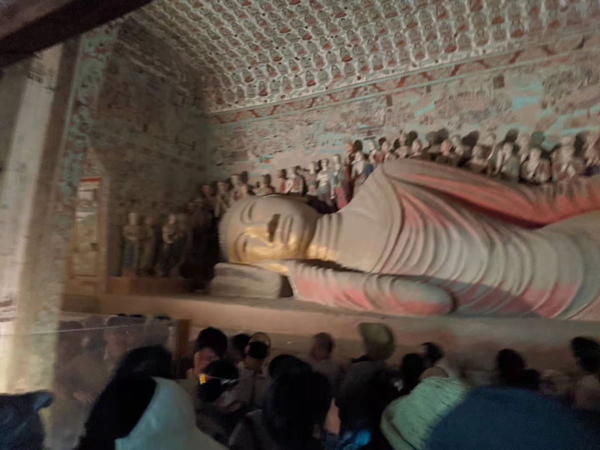 洞窟の中に入ると、想像していたよりはるかに大きな仏像に圧倒される。洞窟には厳かで神秘の気が漂っていた。