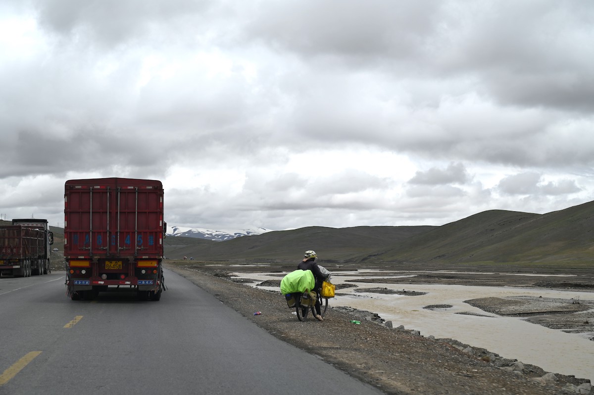 自転車ツーリングの人が拉薩に向かい走っていた。