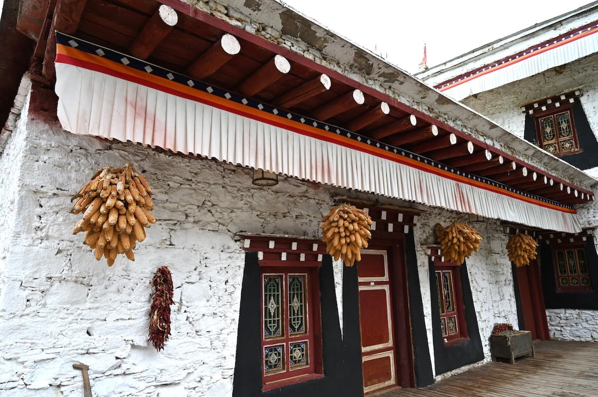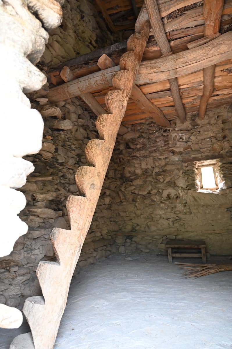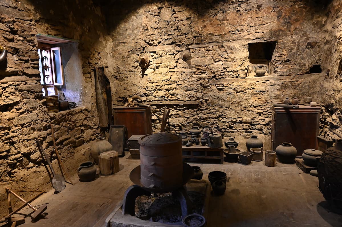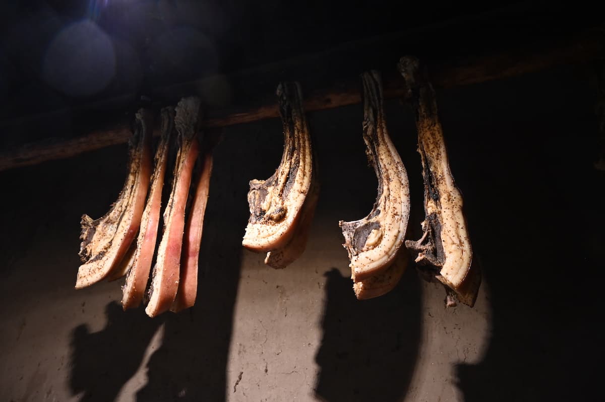 塔に近い部屋には大きな豚肉が天井から吊るされ、石と泥で固められた建物は食品の保存にも適していたのだろう。村の家の壁は白で、一部に褐色の紋様があり、天人合一の理想を表現しているという。