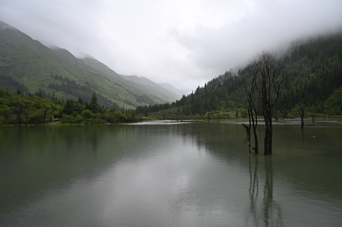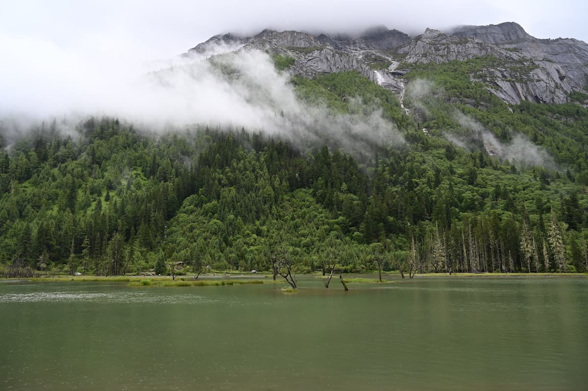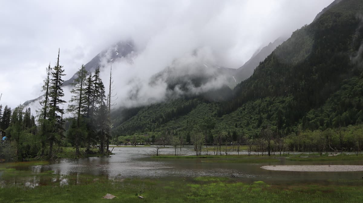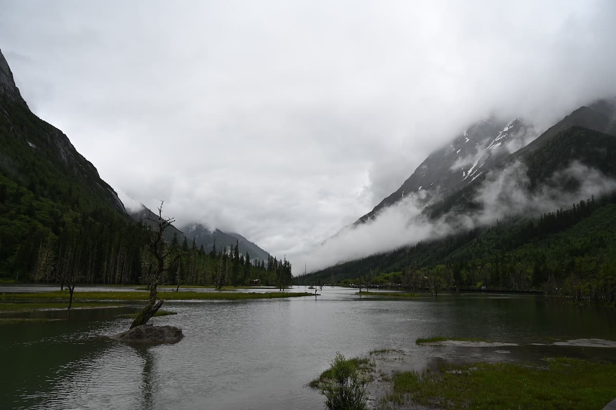 双橋溝で最も美しい湖の四姑娜措(湖)を歩いた。湖の最奥まで行くと、人もいない静寂の中で湖に霧が立ち込める墨絵のような風景があった。湖の浅瀬、湿地には季節の花が咲き、水草の緑と、澄んだ水の美しさに感動する。