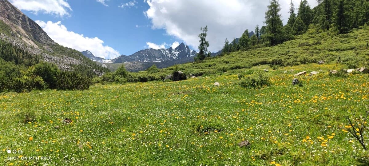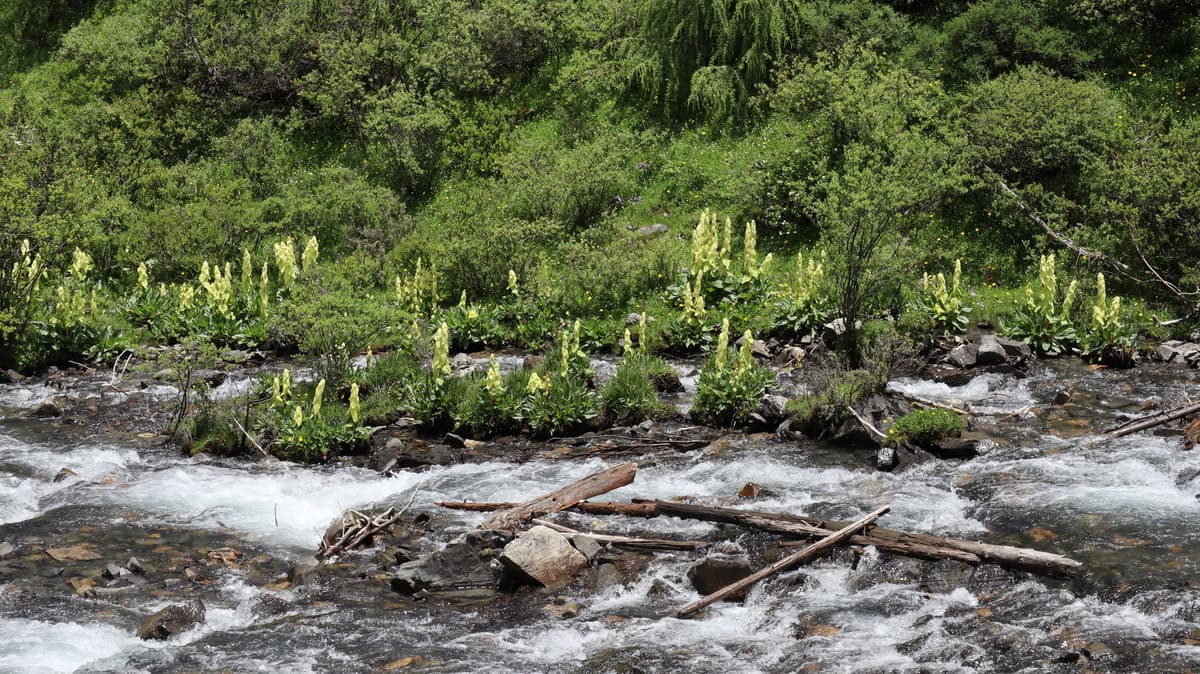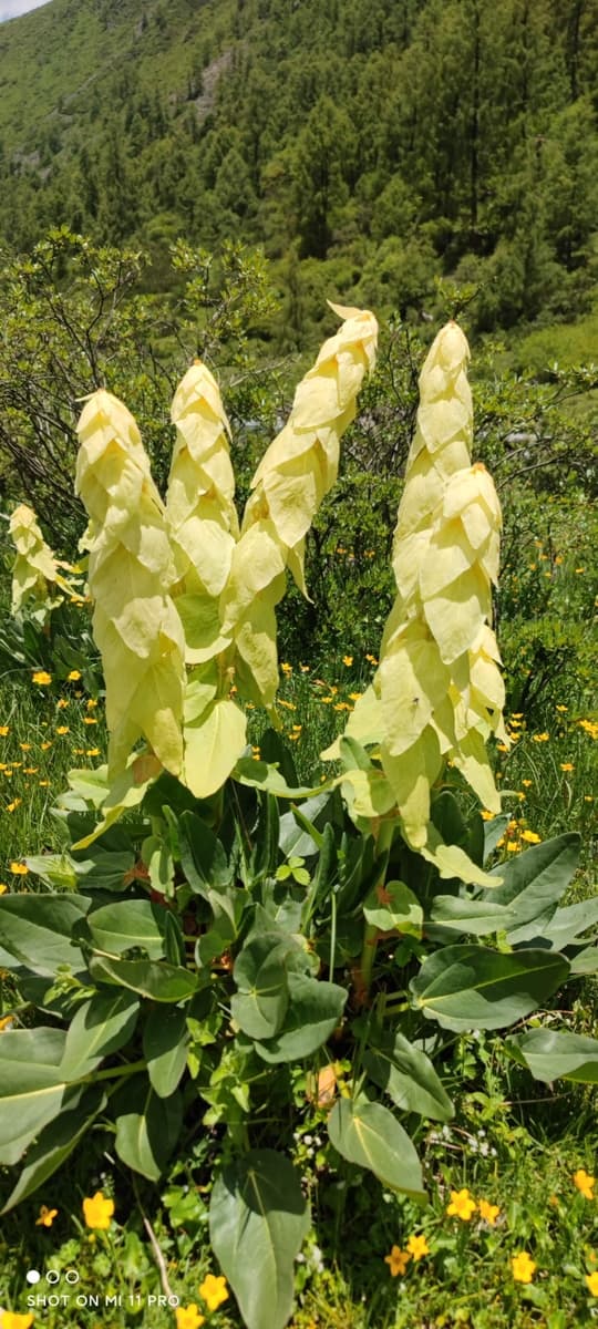 甲玉拉措に向かう渓谷沿いに蓼科の植物、苞叶(葉)大黄、水黄とも言う、があった。黄色い大きな葉が塔のように何層も積み上がり40㎝ほどの高さに伸びている。大きくなれば80㎝ほどになる。チベット東部から四川省西部、雲南省西北部の3,000m~4,500mの高原湿地に育つ植物。花期は6月~8月で赤い花が咲く。ヒマラヤ、チベットの4,000m~4,800mの高山には搭黄という高さが1.5m~2mにもなる苞叶大黄とそっくりの兄弟植物がある。